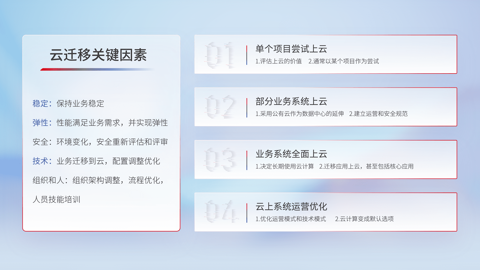 结合实际业务,,,,从规划设计、、、云平台选型、、、云原生改造、、数据迁移、、集成交付,,,,迁移全过程为客户识别最佳上云路径,,,,做好风险识别管理,,,设计网络架构、、、、身份权限、、安全审计合规、、操作审计、、、、日志审计、、、监控告警策略、、、、多站点容灾设计等,,,,对云上基础设施进行整体规划,,,,提升IT治理水平,,以满足弹性、、、、高可用、、、高性能的需求。。。