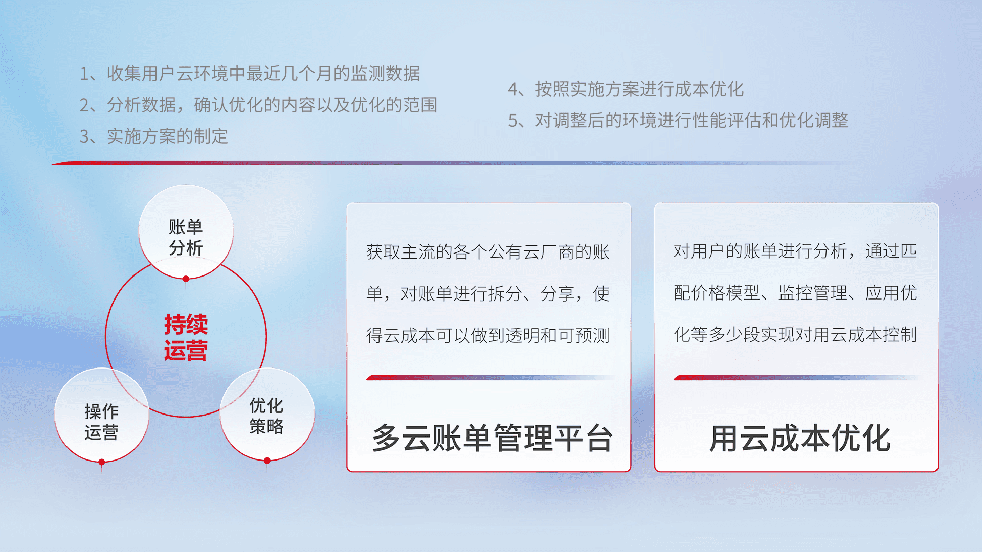 通过多云纳管,,以统一的资源数据模型把客户的云资源进行抽象和封装,,,,进而实现对多云资源的统一操作,,保障云资源管理的可靠性、、稳定性与可用性。。量身定制化运维内容,,配置、、开发运维、、、、补丁管理、、、、备份、、、、监控、、认证和访问管理、、审计和日常巡检等,,,,保障在用云过程中的可靠度,,稳定度以及高可用率。。。。